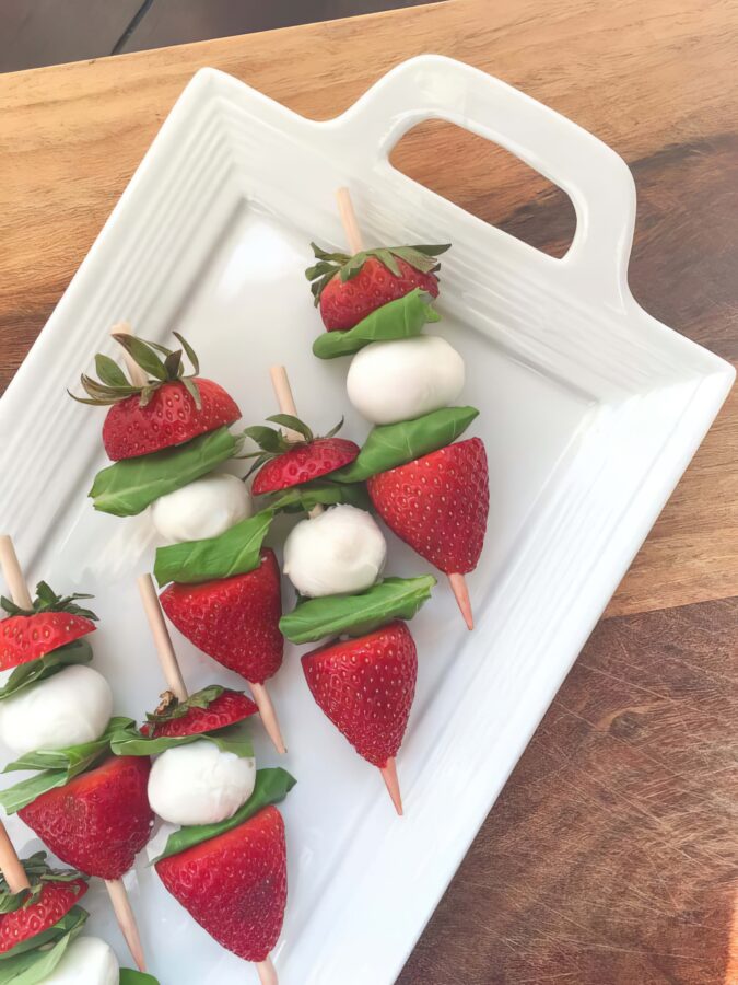 - Repeat with the remaining strawberries, basil, and Mozzarella until you have 16 completed skewers. Arrange skewers on a serving platter and set aside.